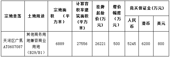资料显示,该地块编号为穗规划资源挂出告字〔2020〕106号。宗地面积6889㎡,计容建筑面积27556㎡,起始价26221万元,竞买保证金5245万元。