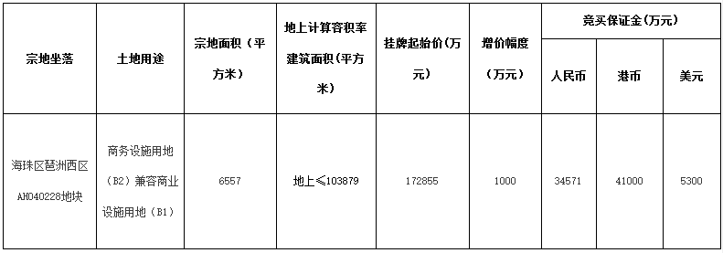 资料显示,该地块编号为穗规划资源挂出告字〔2020〕107号。宗地面积12789㎡,可建设用地面积10036㎡,计容建筑面积≤32918㎡(其中商业建筑面积≤10%),起始价31092万元,竞买保证金6218万元。